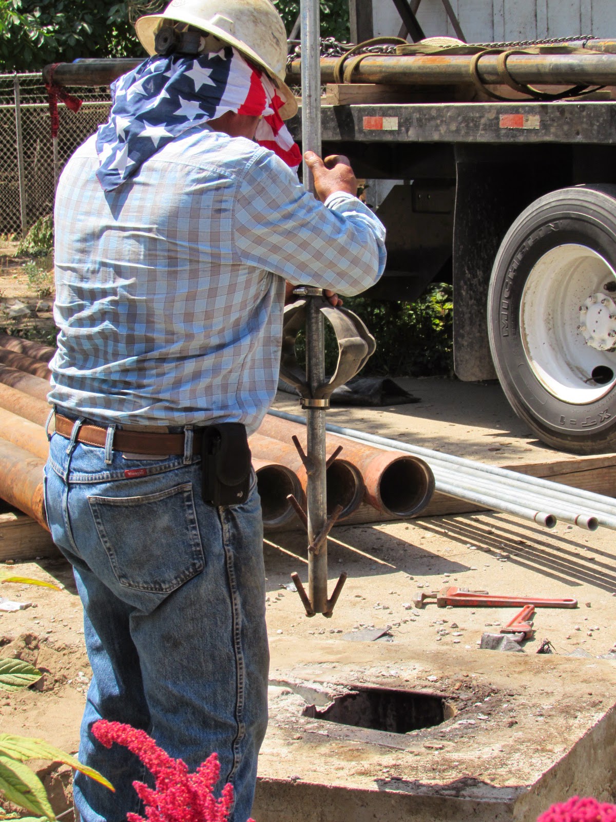 Section after section was added. (See the pipes behind him?) They used all of the 4" pipe. Once it was all lowered into the well, one section at a time, they added an elbow.